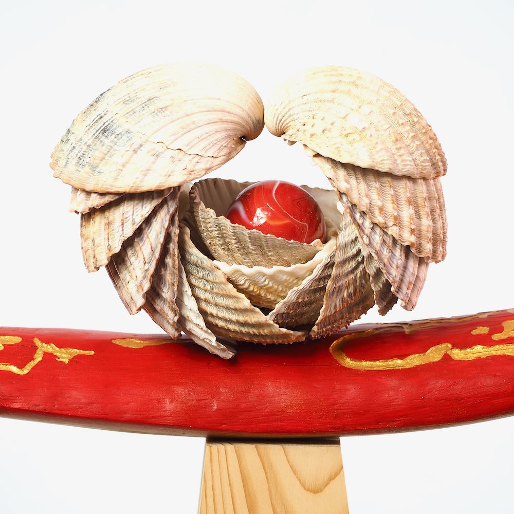 My husband found this curved piece of wood on a dog walk and gave it to me as a present. I was thrilled with the surface quality and the shape. The Bark Beetle grooves looked like complicated Cinnabar carvings to me and I immediately saw red in the shade of Cinnabar – and gold – to emphasize them. The curved shape demanded a centrepiece to balance it and so the cockle shells embracing the red marble found their home. The whole sculpture is influenced by the samurai swords and art of Japan. Finally the plinth which my husband made for me puts the sculpture on its elevated position.