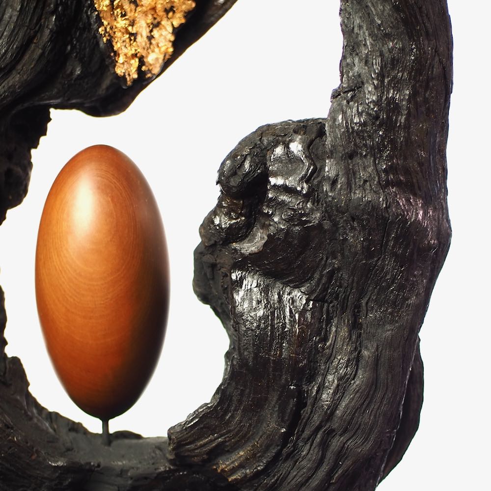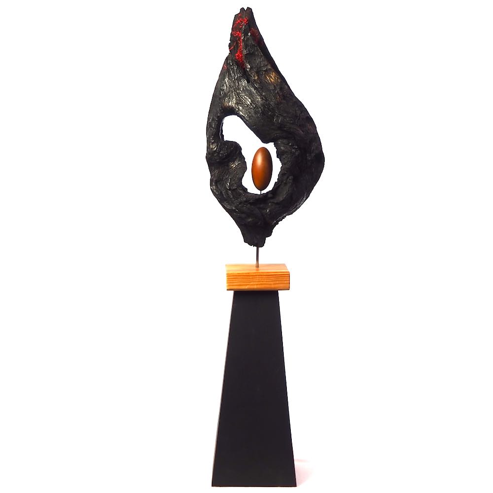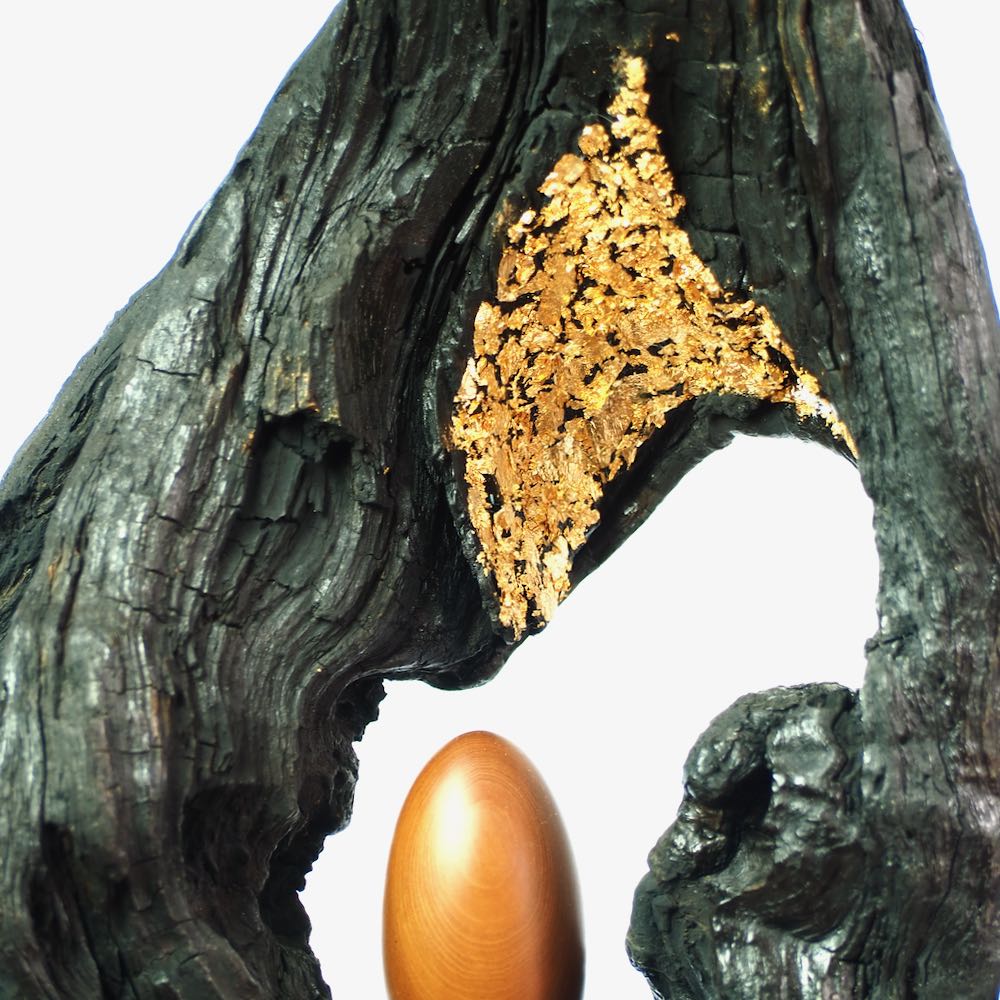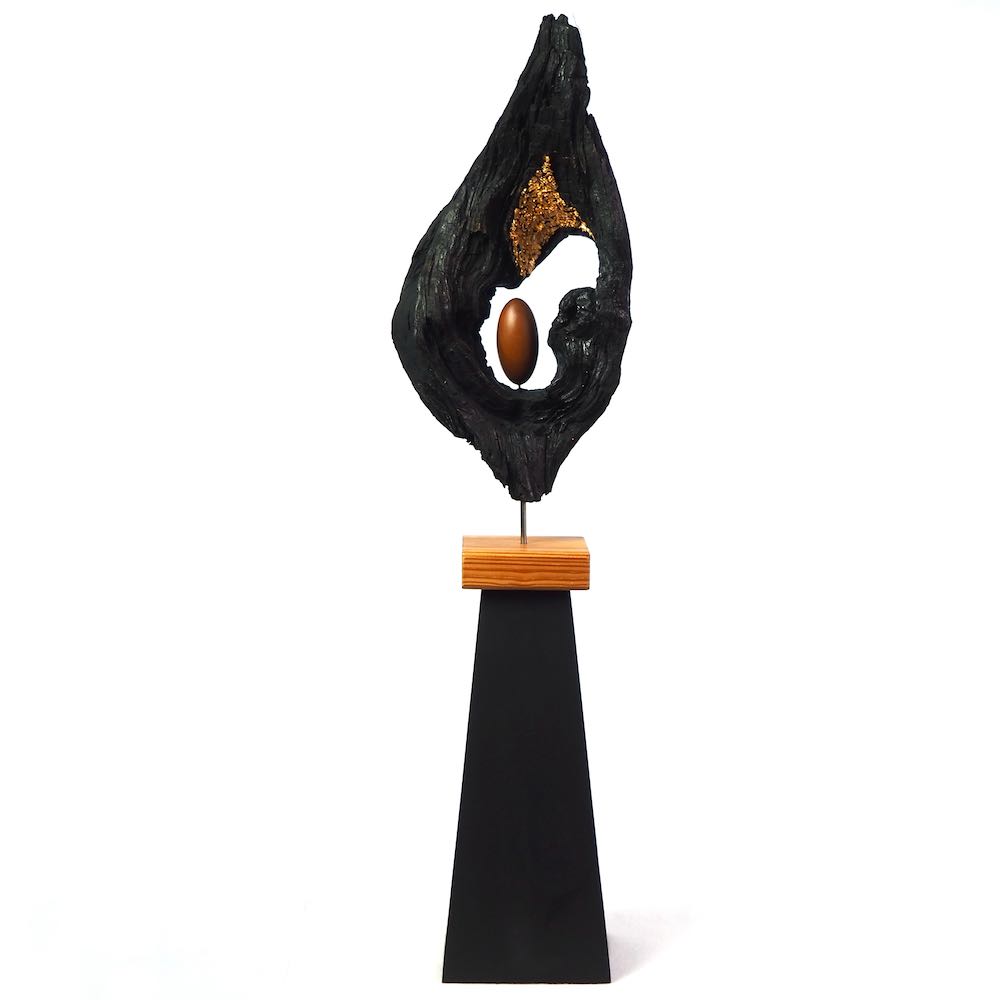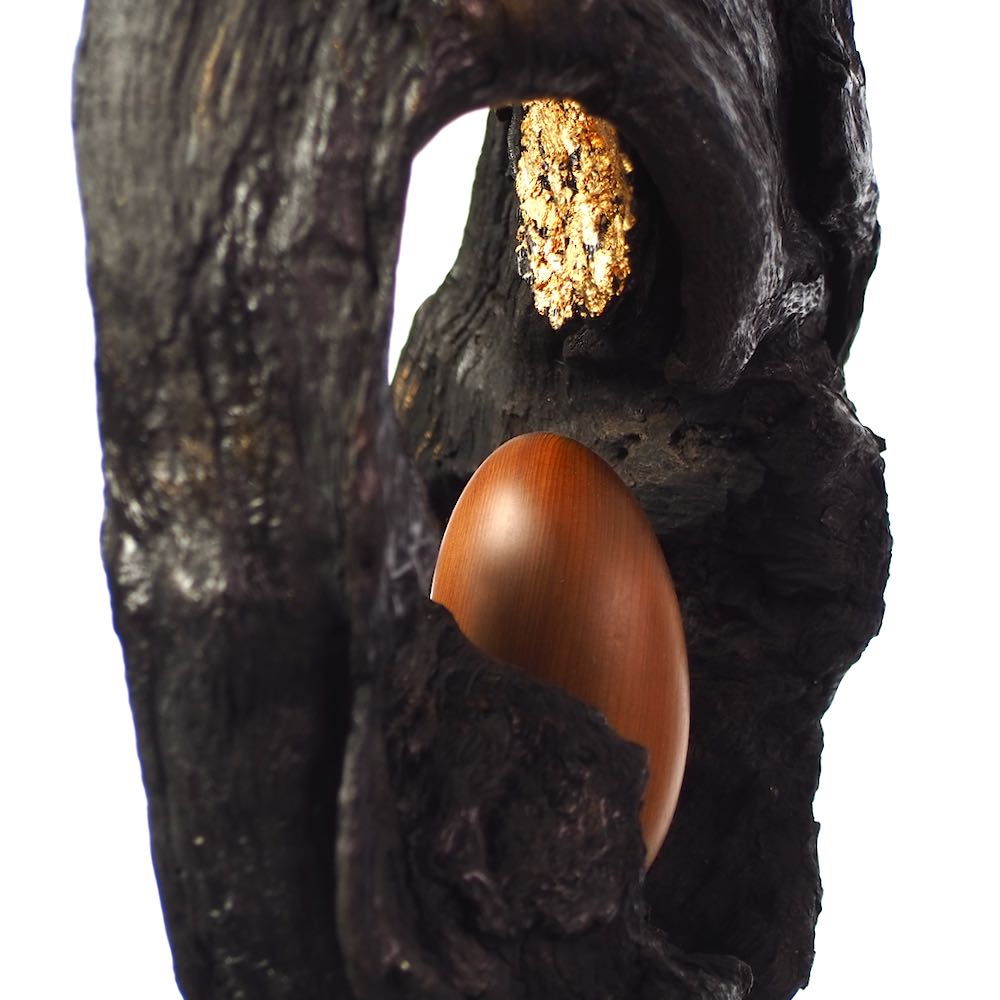 I found the top piece of this sculpture two years ago and was fascinated by the different surface textures and the shape of the opening.  I cleaned and stabilised the wood and decided to contrast it in black with a very evenly turned and polished egg shape of olive wood.  Finally gold leaf highlights the opening of the wood and invites us to look into the future.  My husband made the pyramidal plinth for it and this gives it the right hight to explore all the details.