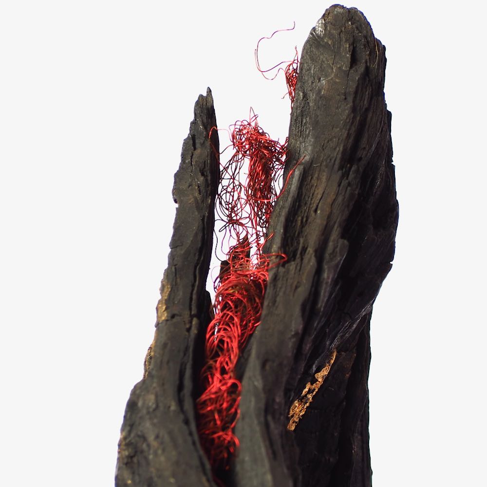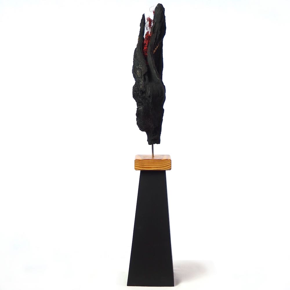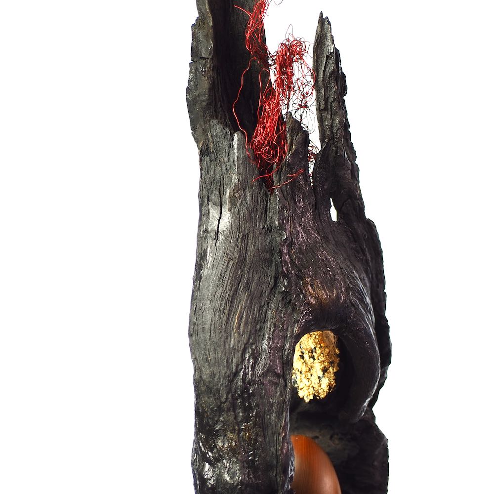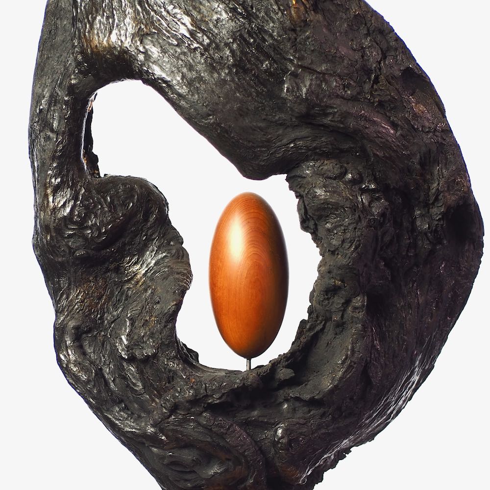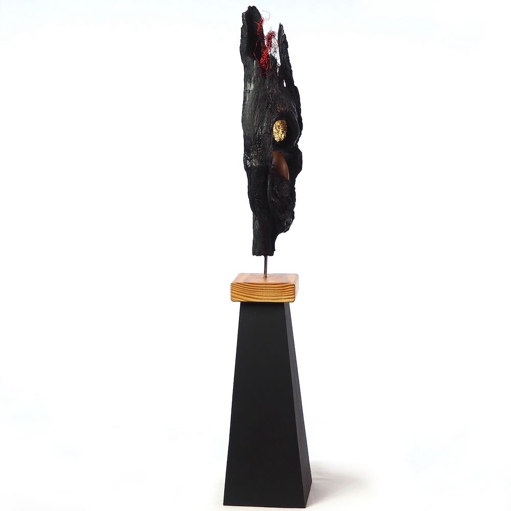 I found the top piece of this sculpture two years ago and was fascinated by the different surface textures and the shape of the opening.  I cleaned and stabilised the wood and decided to contrast it in black with a very evenly turned and polished egg shape of olive wood.  Finally gold leaf highlights the opening of the wood and invites us to look into the future.  My husband made the pyramidal plinth for it and this gives it the right hight to explore all the details.