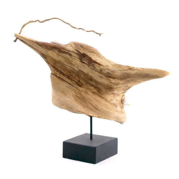 This sculpture was inspired by its beautiful curved and elegant shape.  The split in one end suggested a bird and the little branch in its beak manifests this illusion.  The eye is in the shape of the most smooth marble shape and leads back to the idea of a bird.  On the other side of the sculpture the flint pebble is nestled in its hollow and balances the sculpture with its intricacy.